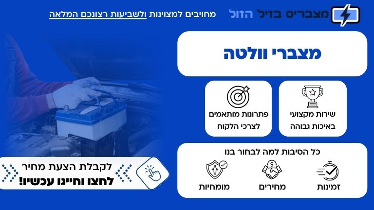 מצברי וולטה אינם כמו מצברי וולקן לדוגמה. למצברי וולטה יתרונת מסוימים על פני מצברי ג’ל ולמצברי סילבר יתרונות מסוימים על פני מצברי וולטה. המלצתי היא בשום פנים ואופן לא לפנות למוסך רגיל בנושא מצבר הרכב שלכם. פנו ישירות לחברות כדוגמת Full Power המתמחות בתחום ספציפי זה. בדיוק כמו שעבור בעיה בעין תלכו להיבדק ע”י רופא עיניים. אז התקשרו עוד היום לחברת Full Power או דומות ואל תתנו לחוק מרפי לנצח אותכם. פעלו עכשיו.