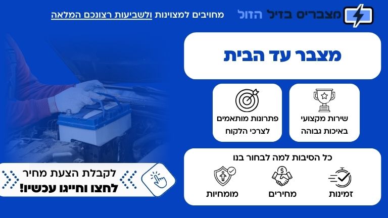 מצבר עד הבית הינו שירות חיוני הכולל: הגעה של צוות מקצועי עד לביתכם, שימוש בציוד ומכשור ייעודיים, החלפת מצבר במהירות וביעילות וחילוץ ממצב הביש ביחס אישי ואדיב לכל לקוח. החלפת מצבר הינה פעולה חיונית ושכיחה, אולם ישנם מצבים בהם לא ניתן להגיע למוסך וקיים צורך בהחלפת מצבר במקום החנייה של הרכב סמוך לביתכם.